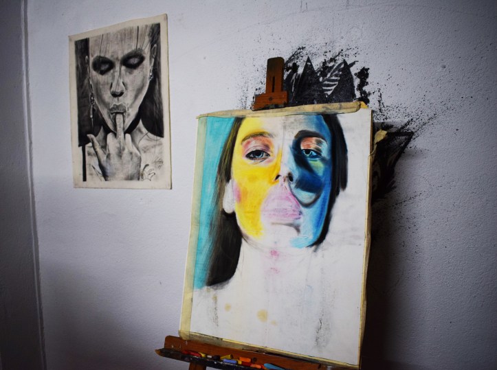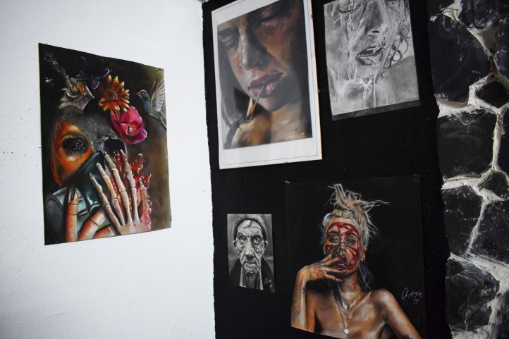 En su taller, en el que ha diseñado hasta los muebles, las paredes están decoradas con muchas de sus obras. Nos confiesa que se ha negado a vender algunas de ellas por los propuestas económicas irrisorias que le ofrecían. Y es que Christian no tiene una dilatada experiencia de decenas de años como artista, pero sí que ha puesto todos sus esfuerzos en mejorar y trabajar concienzudamente día tras días desde una tarde lluviosa de 2017. Reconoce que entonces, cuando se plantó delante de un papel en blanco dispuesto a dibujar una cara mitad león y mitad calavera, comenzó su nueva vida y decidió cambiar el mal momento que atravesaba, relacionado éste con una enfermedad mental en la que hace hincapié en varias ocasiones, y que le afectaba emocionalmente para la creación. De hecho, asume que esto afectó en lo que transmitía a través de sus primeras obras, en las que, dice Christian, «había mucha tristeza y mucho dolor.»