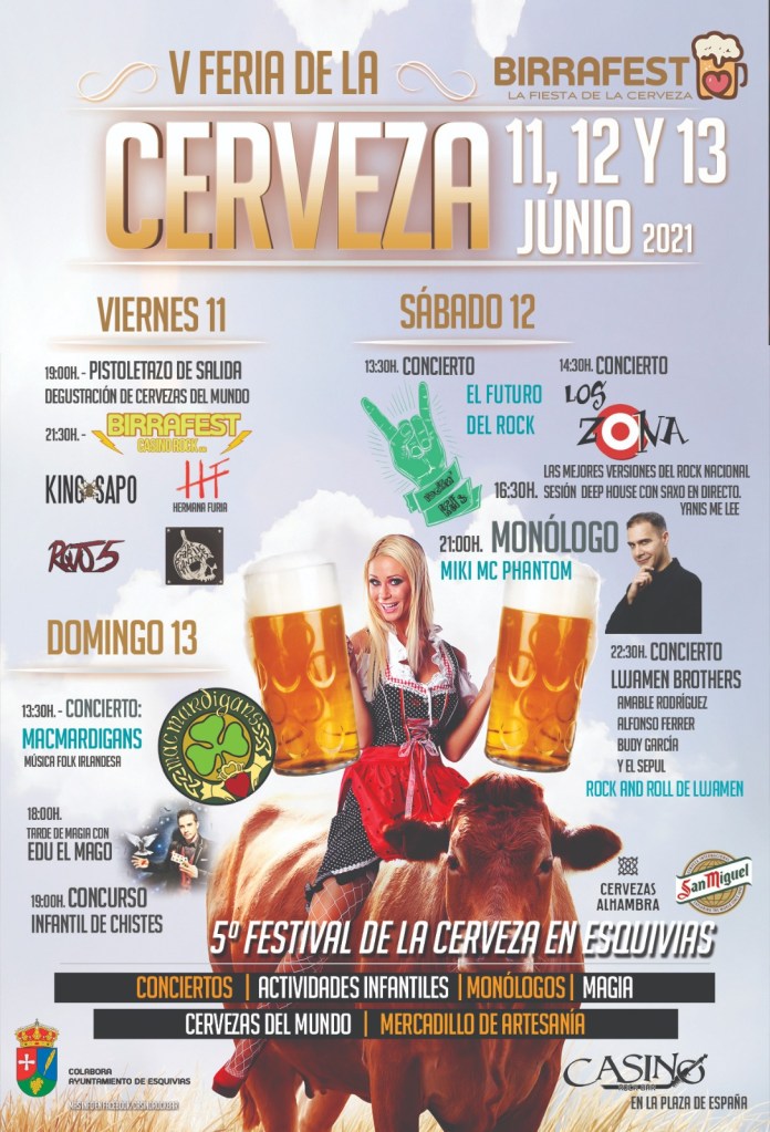 Tras un año sin música en directo, con restricciones de todo tipo y meses de confinamiento incluidos, la Fiesta de la Cerveza regresa al Casino Rock Bar de Esquivias en su 5ª edición. Con más ganas que nunca, podremos disfrutar de varios conciertos, espectáculo de magia, un mercadillo de artesanía e incluso, un monologuista, además de mucha cerveza. Durante los días 11, 12 y 13 de junio la diversión estará asegurada.