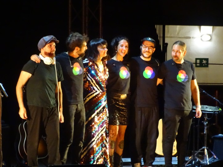 Solo un par de canciones más mantuvieron la intimidad de Juan Aguirre y Eva María Amaral, que llenaron progresivamente la tarima con artistas invitados. Alex Moreno (batería), Ricardo Esteban (bajo), Laura Rubio (fondo voz) y por último Tomás Virgós (teclados) completaron el elenco de un concierto en acústico algo inusual, mucho más grandilocuente de lo normal para un formato de estas características: «Tras estar mucho tiempo sin dar conciertos, bueno muy poquitos, hoy queríamos tener con nosotros a varios amigos en esta noche especial. Tenemos muchos temas y pensamos tocarlos todos, al final nos van a tener que echar de Esquivias hoy», apuntaba la líder del grupo entre risas.