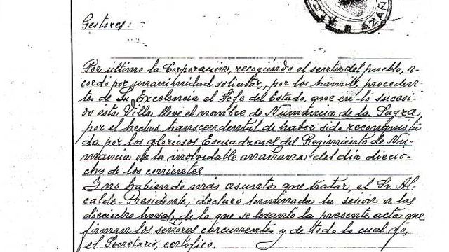 Extracto del acta que refleja el cambio de nombre de Azaña por Numancia de La Sagra